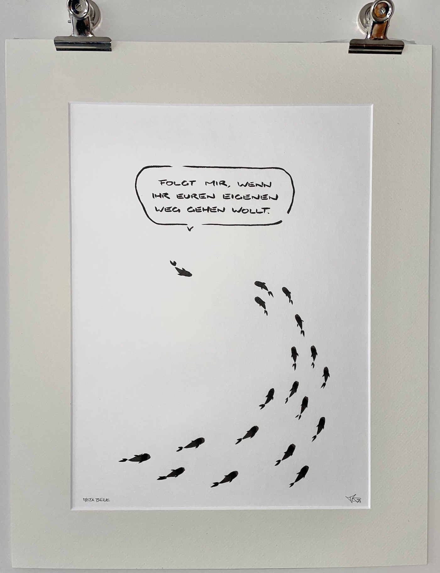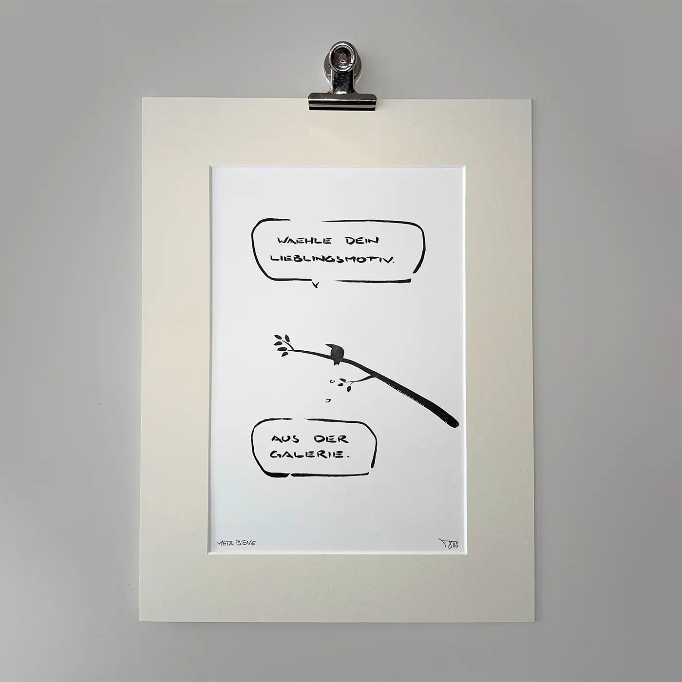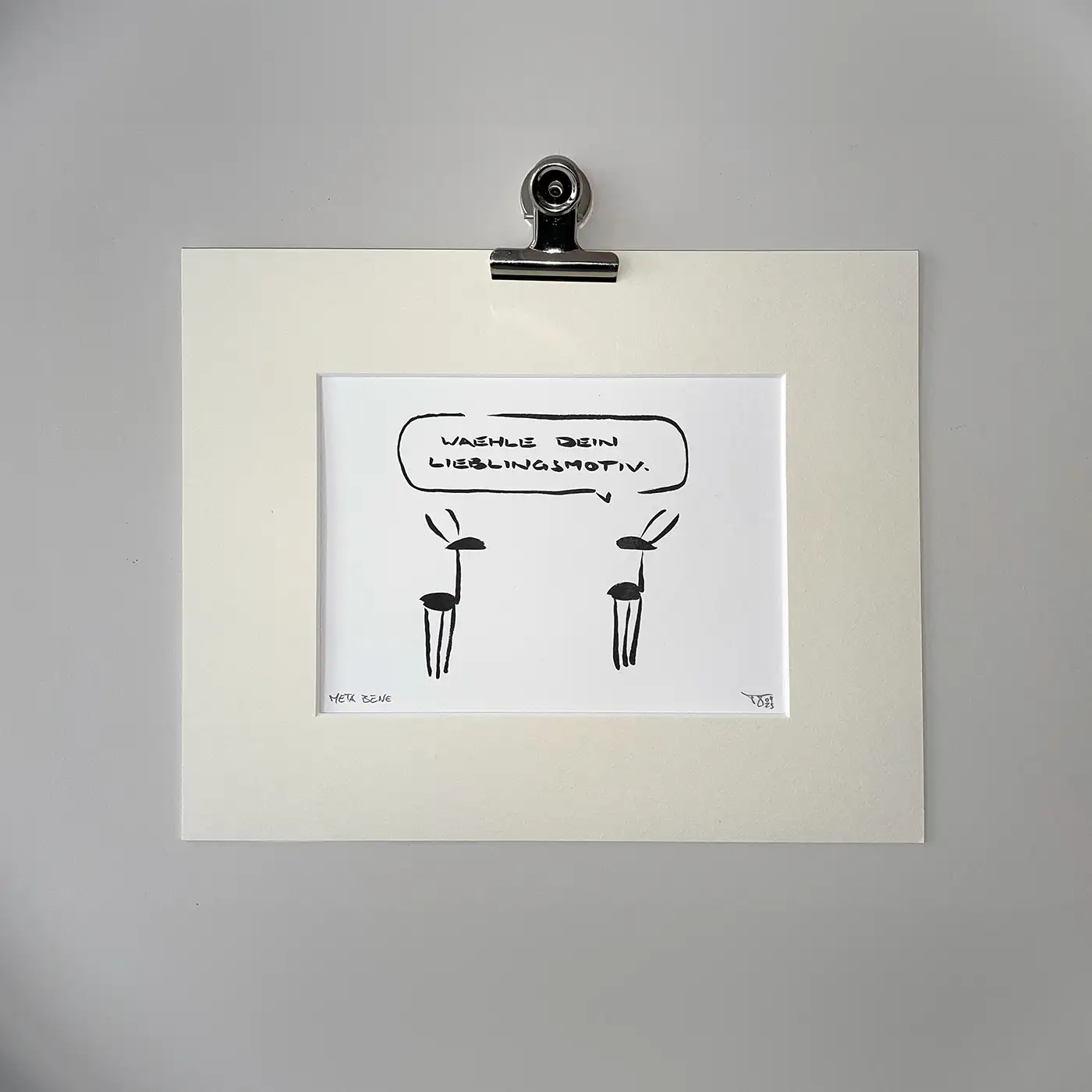 Deswegen findest Du im Shop auch die zwei Kategorien Sonderanfertigungen und Originale. Die Originale sind vorgezeichnete Motive von META BENE. Die Sonderanfertigungen extra für Dich handgezeichnete Motive. Beide Optionen sind als Originale in dem oben erklärten Sinne zu verstehen. Nur, dass der Moment des Ausdrucks bei den Sonderanfertigungen in einem persönlichen Verhältnis zu Deiner Bestellung steht.