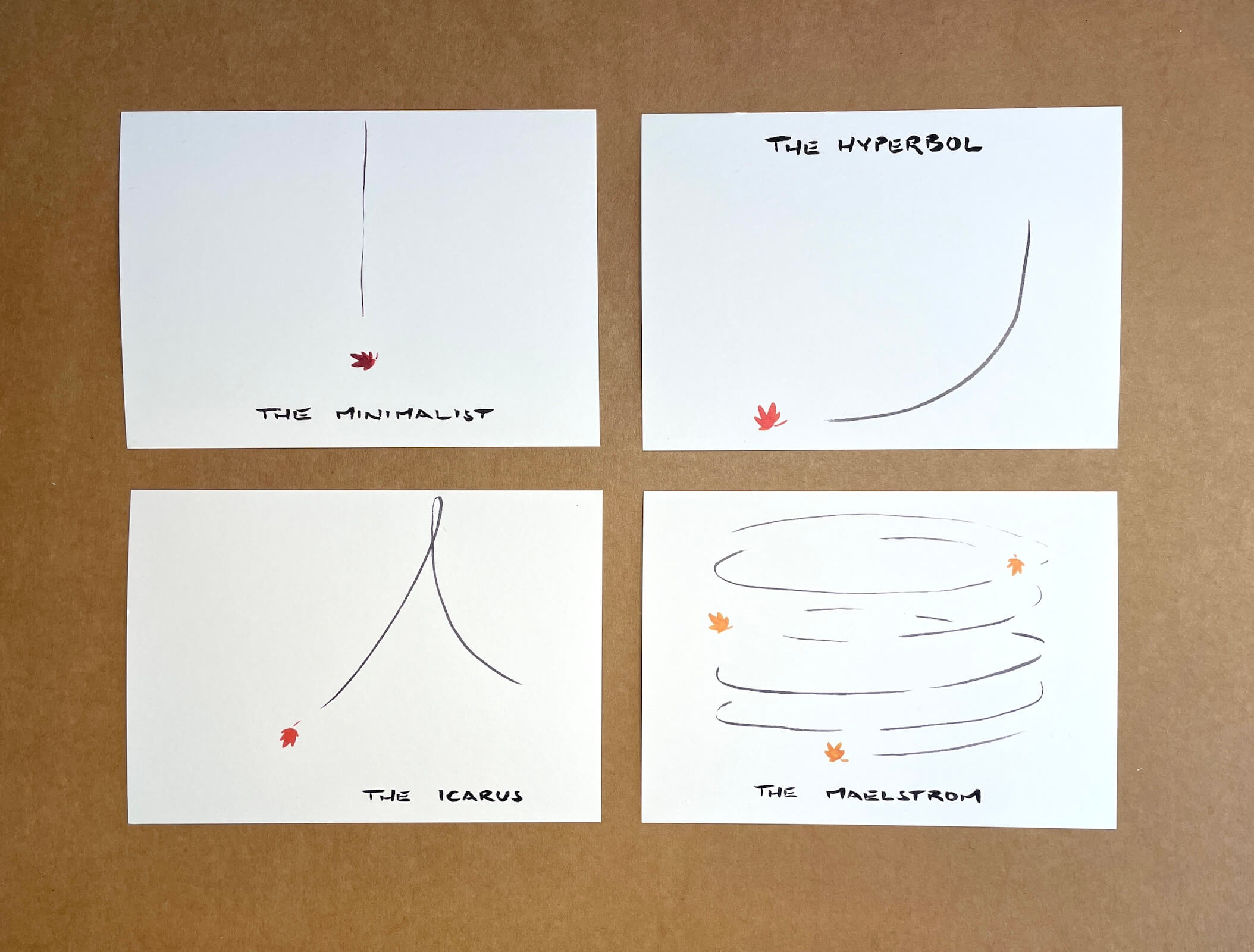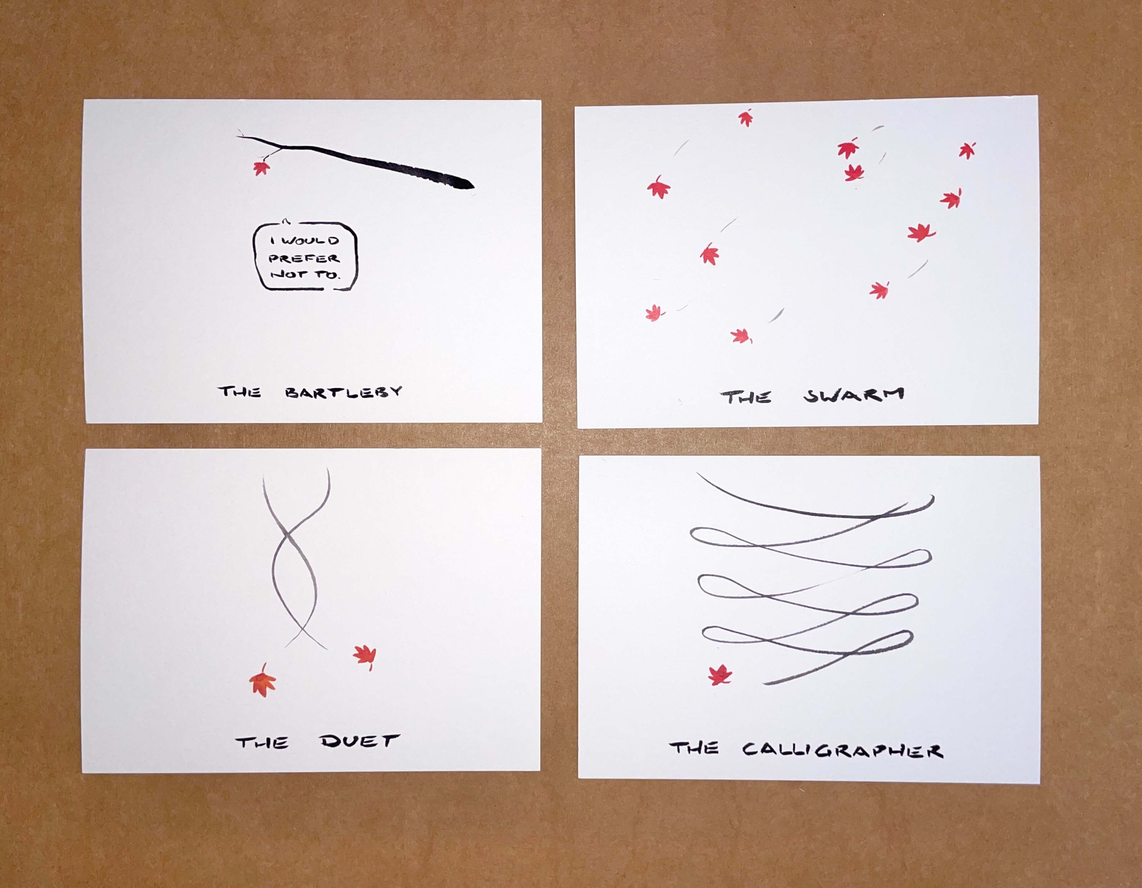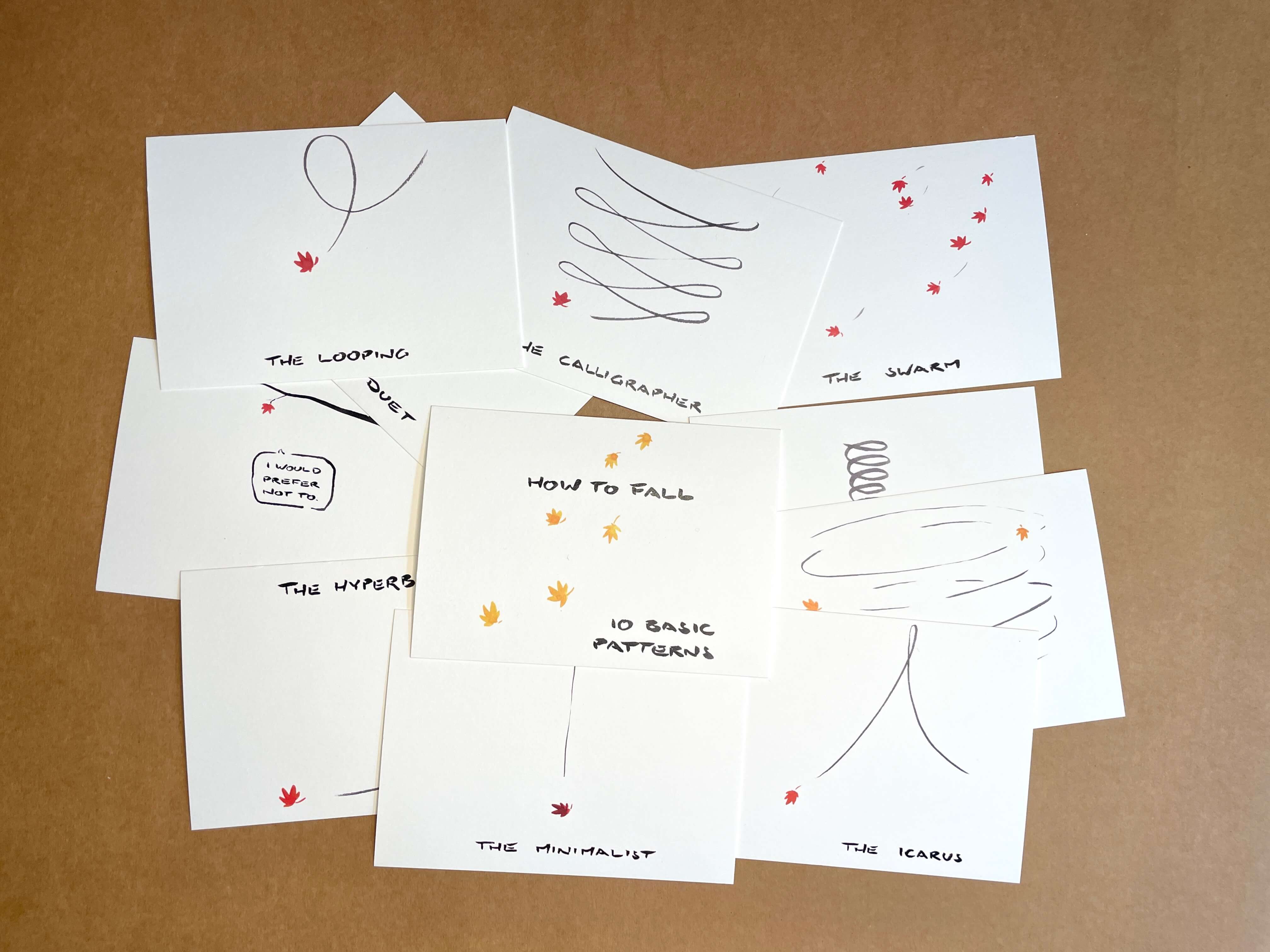11 farbige Motivkarten (DIN A6) mit der kompletten Serie "HOW TO FALL" über die Kunst des Fallens der Blätter. Hochwertiger Digitaldruck auf Munken-Papier (300 g)
